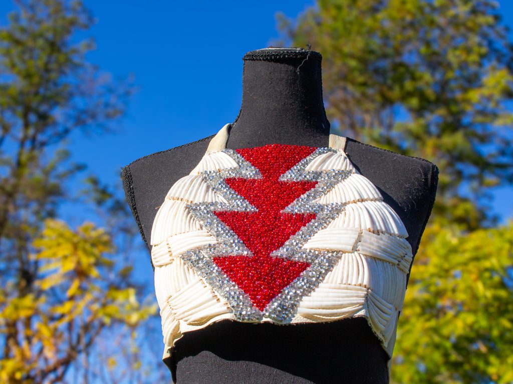 “I think my first piece is one that has a lot of meaning for me, because it was an example of why I thought Indigenous fashion needs representation, and it’s about a holistic idea of wellness and what you put on your body, and what you put on your body matters,” Hostler said.
